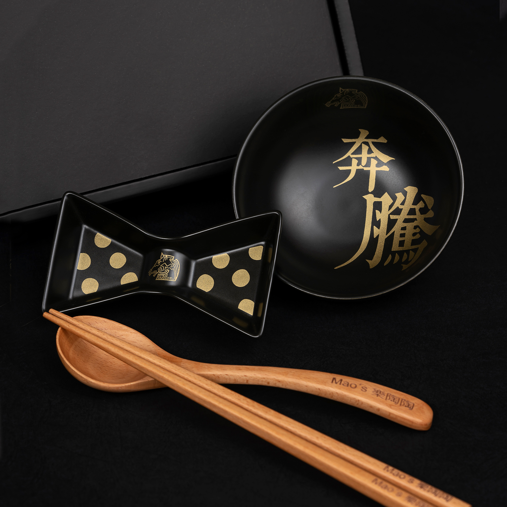 來自鶯歌窯廠製作的瓷碗,霧黑色的設計,高溫1230度費時的窯燒,質感溫潤且沉穩,並將「Mao's樂陶陶」擅用的祝福文字設計,刻劃於碗內,傳承了父親老窯廠四十年的技術與堅持,一樣用心,一樣踏實地做好每一步,如鍊金真純、如萬馬奔騰,一同為金馬喝采。