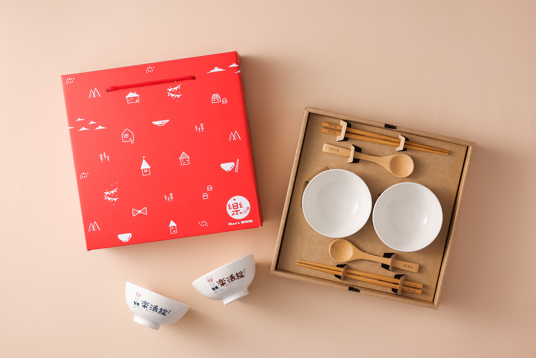 Mao's樂陶陶為益翔建設公司的「樂活綻」建案製作交屋禮贈品,一對雙碗、一對雙筷,祝福順利買到理想中的房子和收到這份禮盒的朋友們,在新房享受快樂的居家生活。