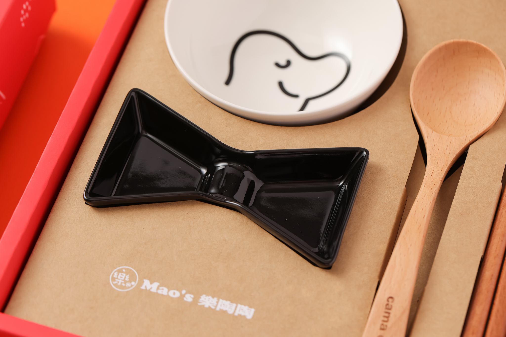 Mao’s樂陶陶這次替cama咖啡店製作員工禮,熟悉Mao’s樂陶陶的朋友都知道蝴蝶結醬油是我們的特色商品!小碗印上Beano的頭像之外,我們特別燒製黑色的醬油碟來代表Beano戴領結的樣貌,禮盒附上湯匙與筷子,讓收到禮盒的人可以在餐桌上享受美好的獨享用餐時光~