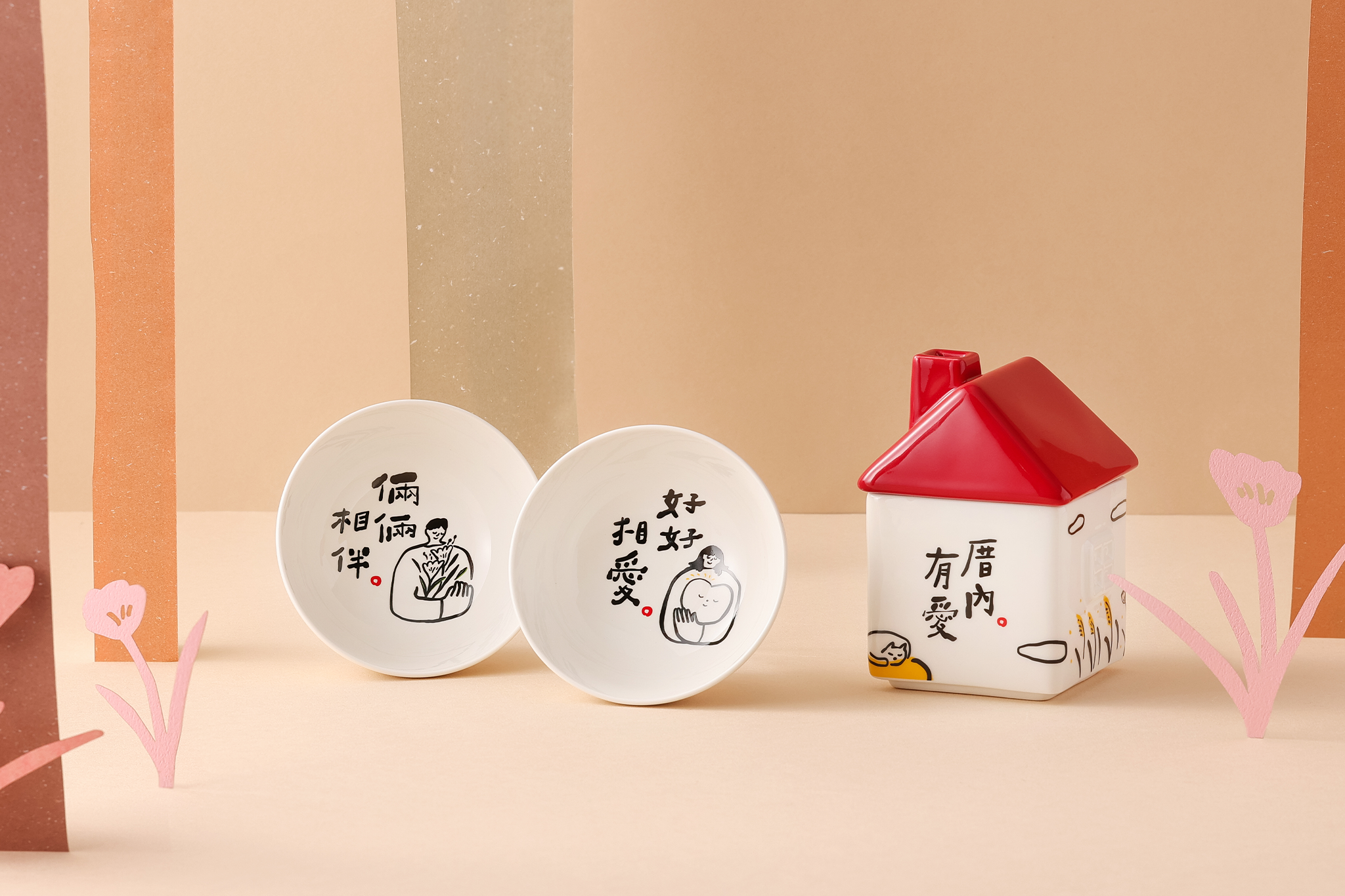 小屋屋頂設計共有兩款——「煙囪」與「動物」造型,融合生活巧思與實用功能,可作為日常花器、擺飾或收納各種用途,搭配碗、盤、醬碟組成的「厝內倆倆相愛系列禮盒」,讓每份器皿,不只是陶瓷容器,更成為家中相愛的美好風景。