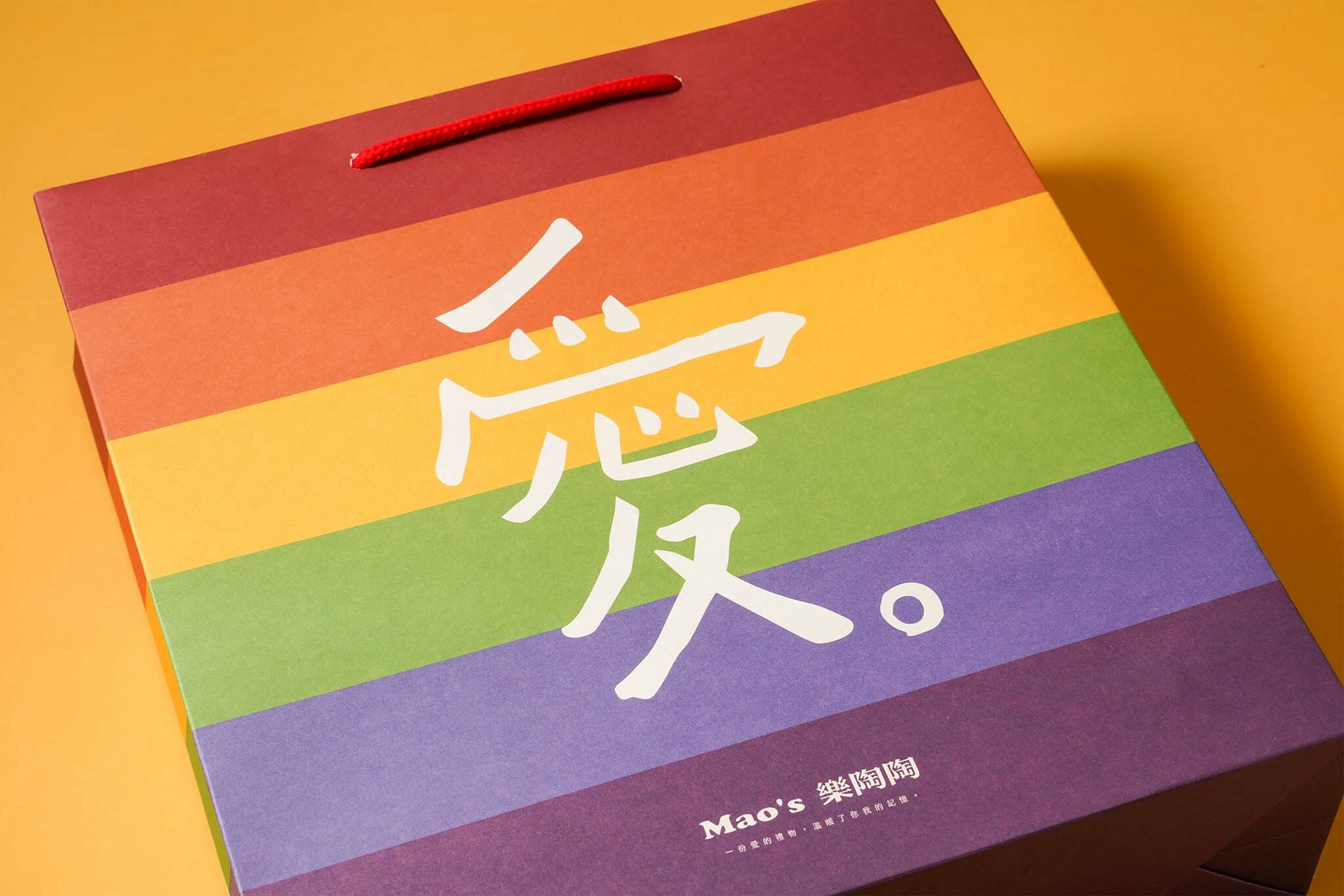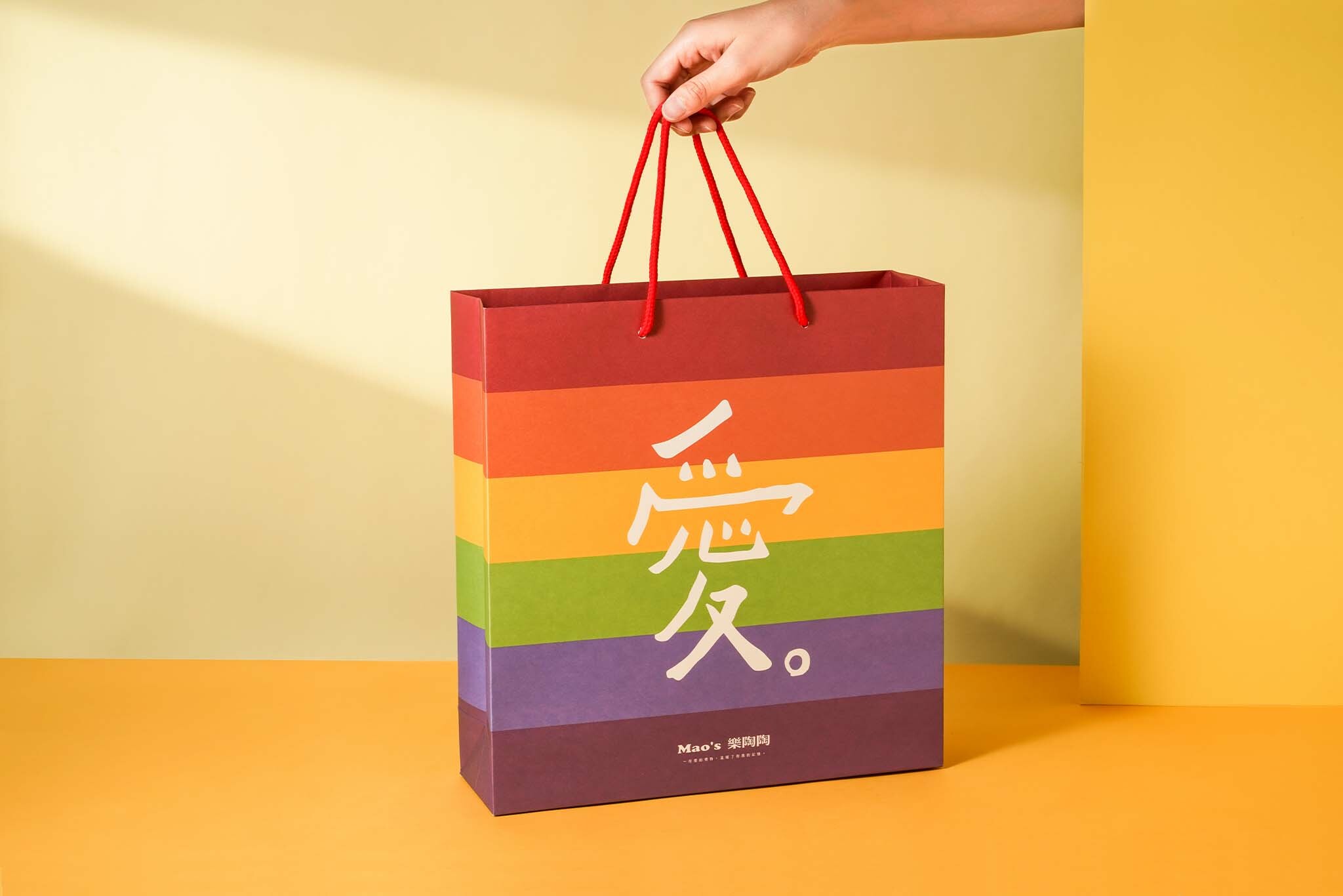 ▲ 彩虹紙袋,凡隨商品禮盒加購彩虹紙袋(30元/入),「Mao's樂陶陶」會將紙袋所得3%捐款至「台灣伴侶權益推動聯盟」,持續為性別平權努力。