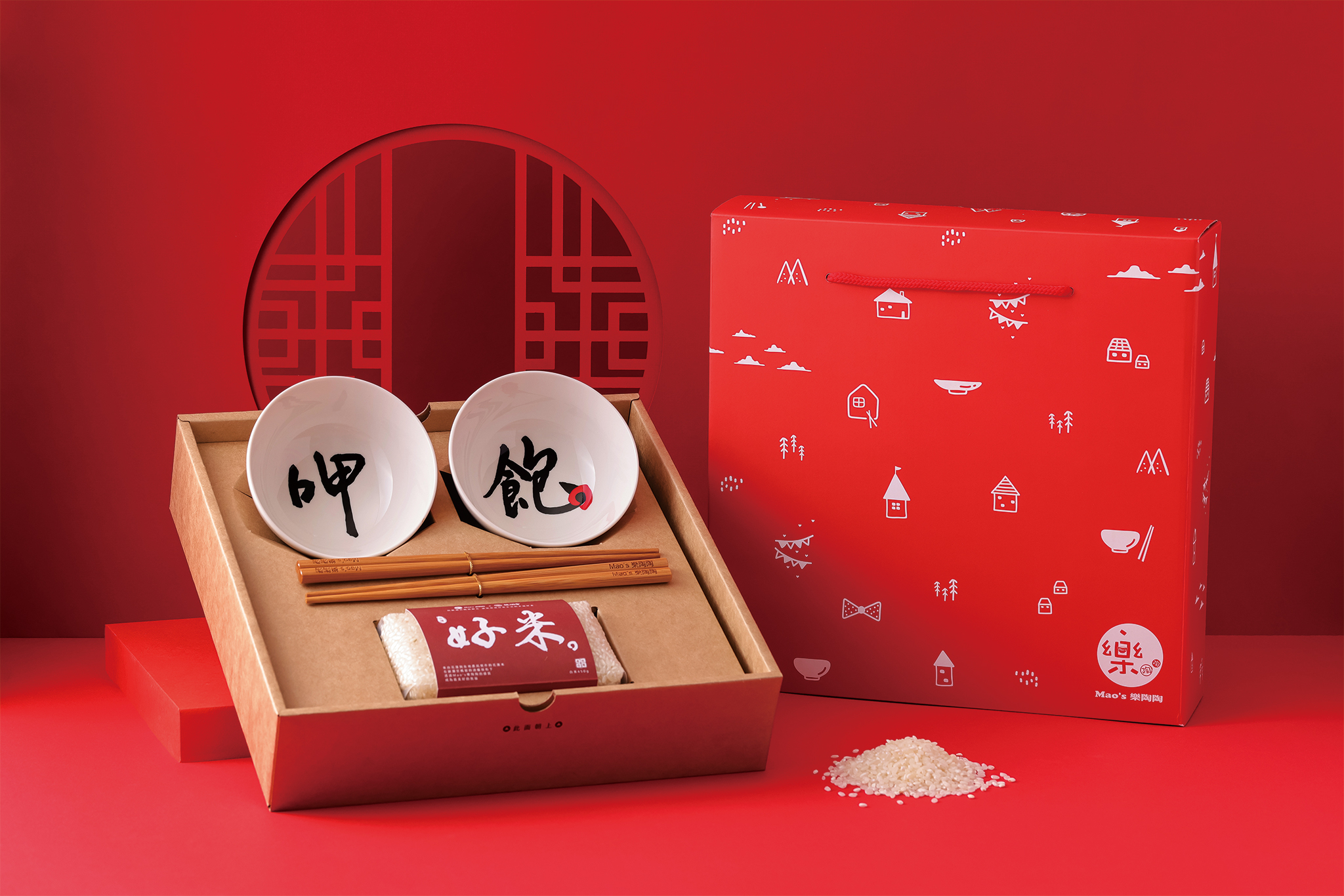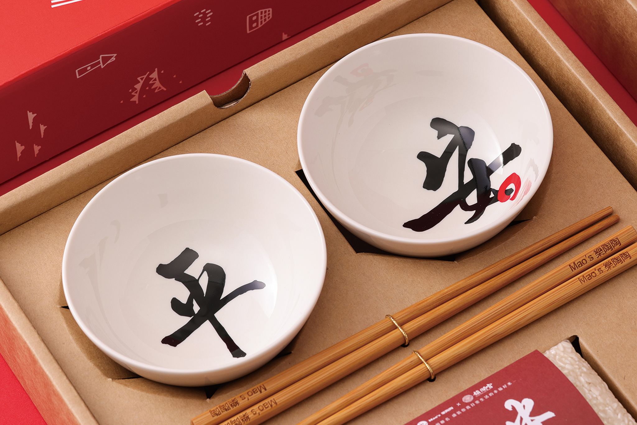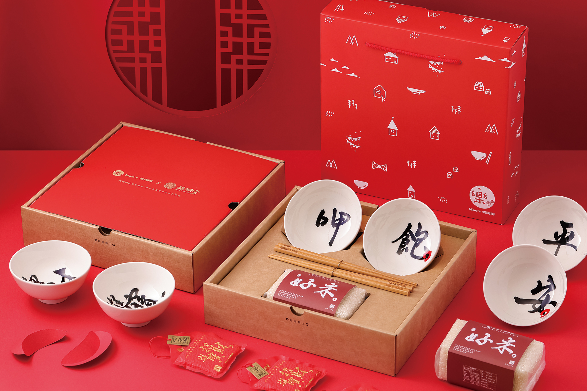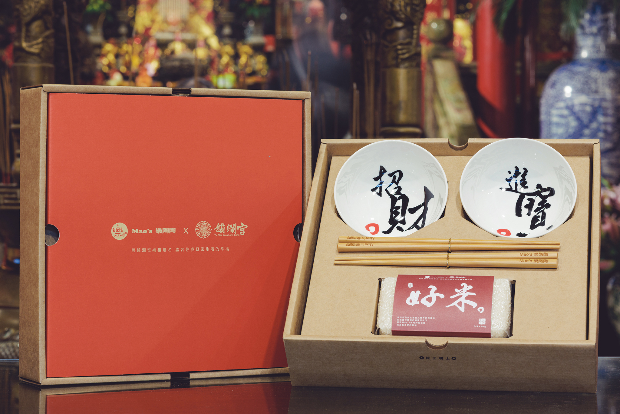 「Mao’s 樂陶陶」與「大甲鎮瀾宮」聯名,特別邀請書法設計「熱血一號」重新詮釋「平安」、「呷飽」、「招財進寶」書法題字,推出「祝福好米禮盒組」。