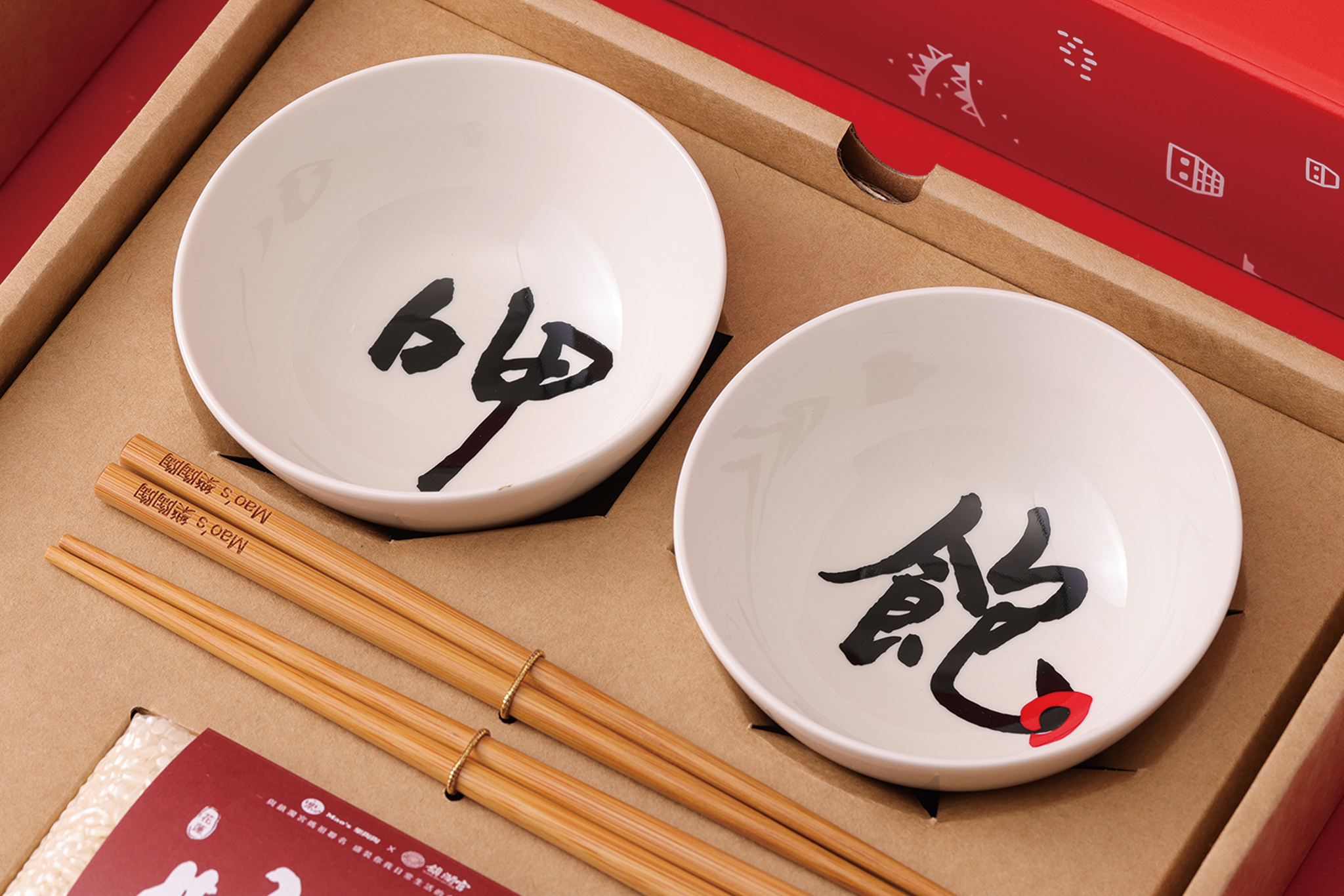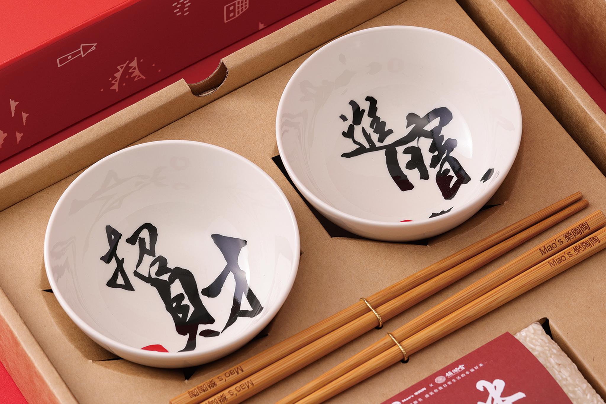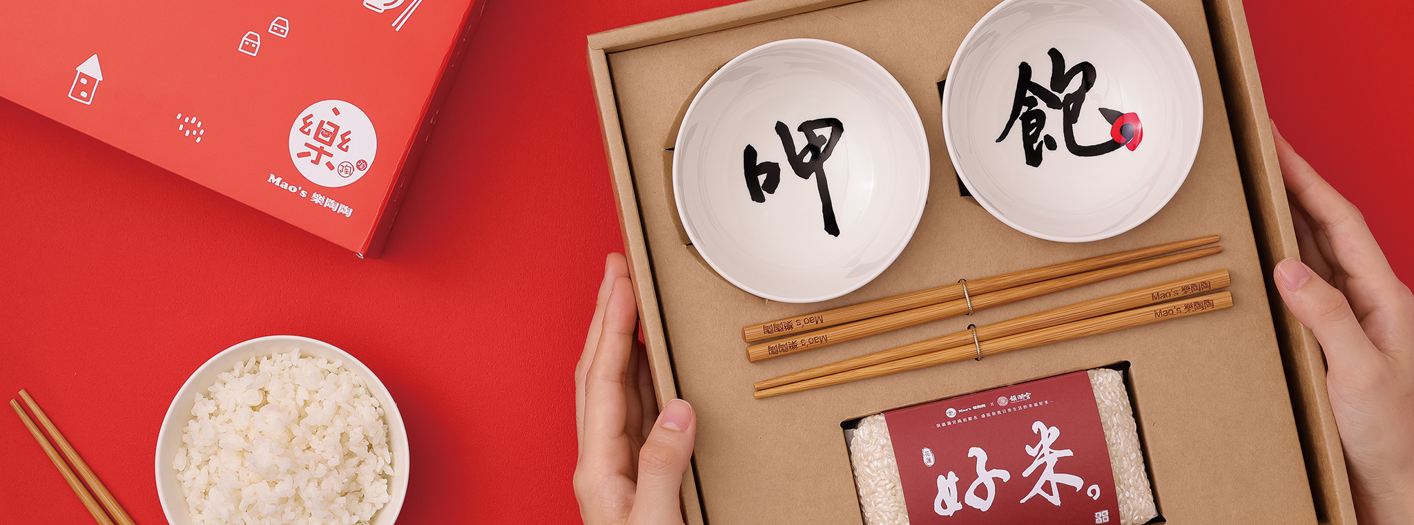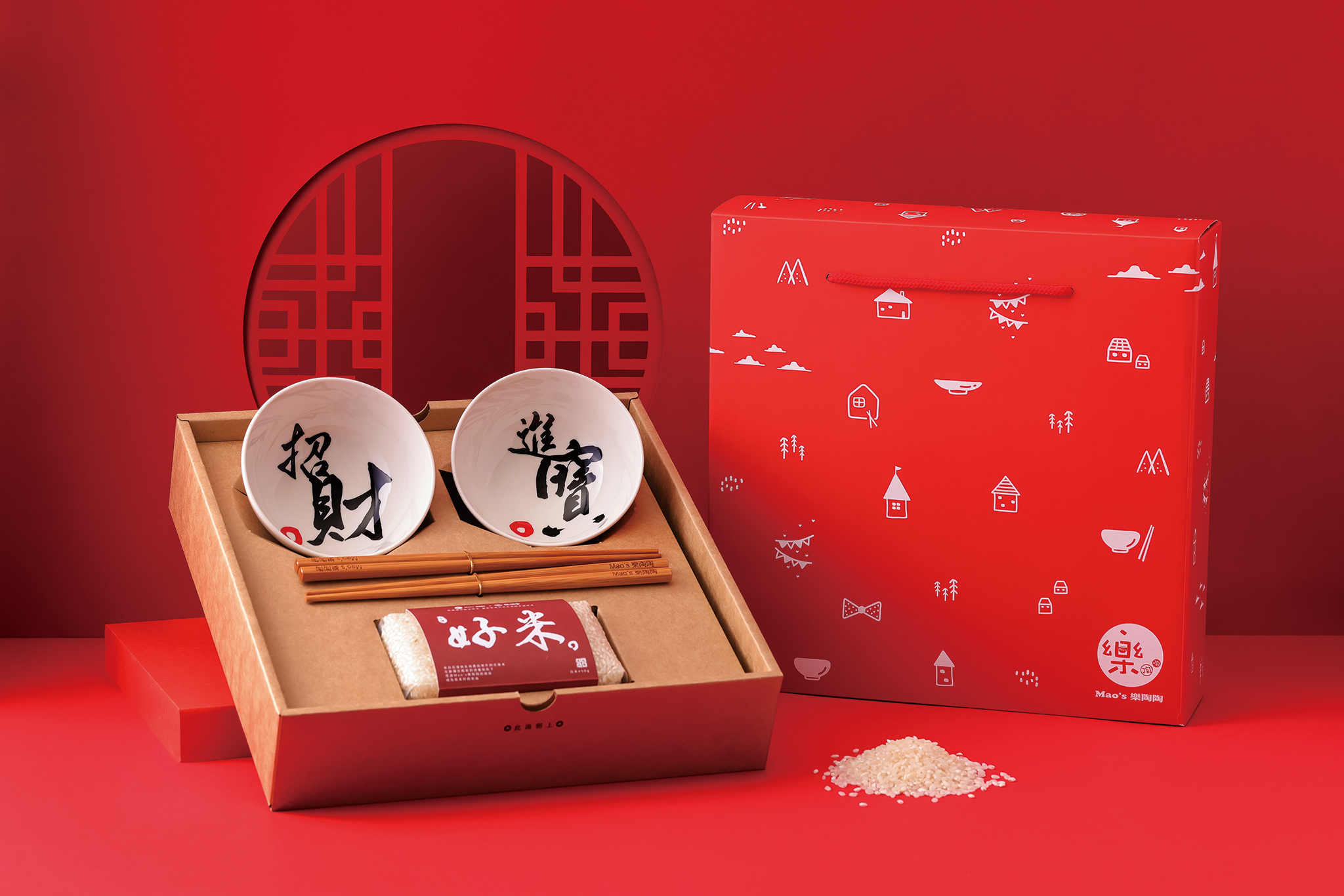 「Mao’s 樂陶陶」與「大甲鎮瀾宮」聯名,特別邀請書法設計「熱血一號」重新詮釋「平安」、「呷飽」、「招財進寶」書法題字,推出「祝福好米禮盒組」。