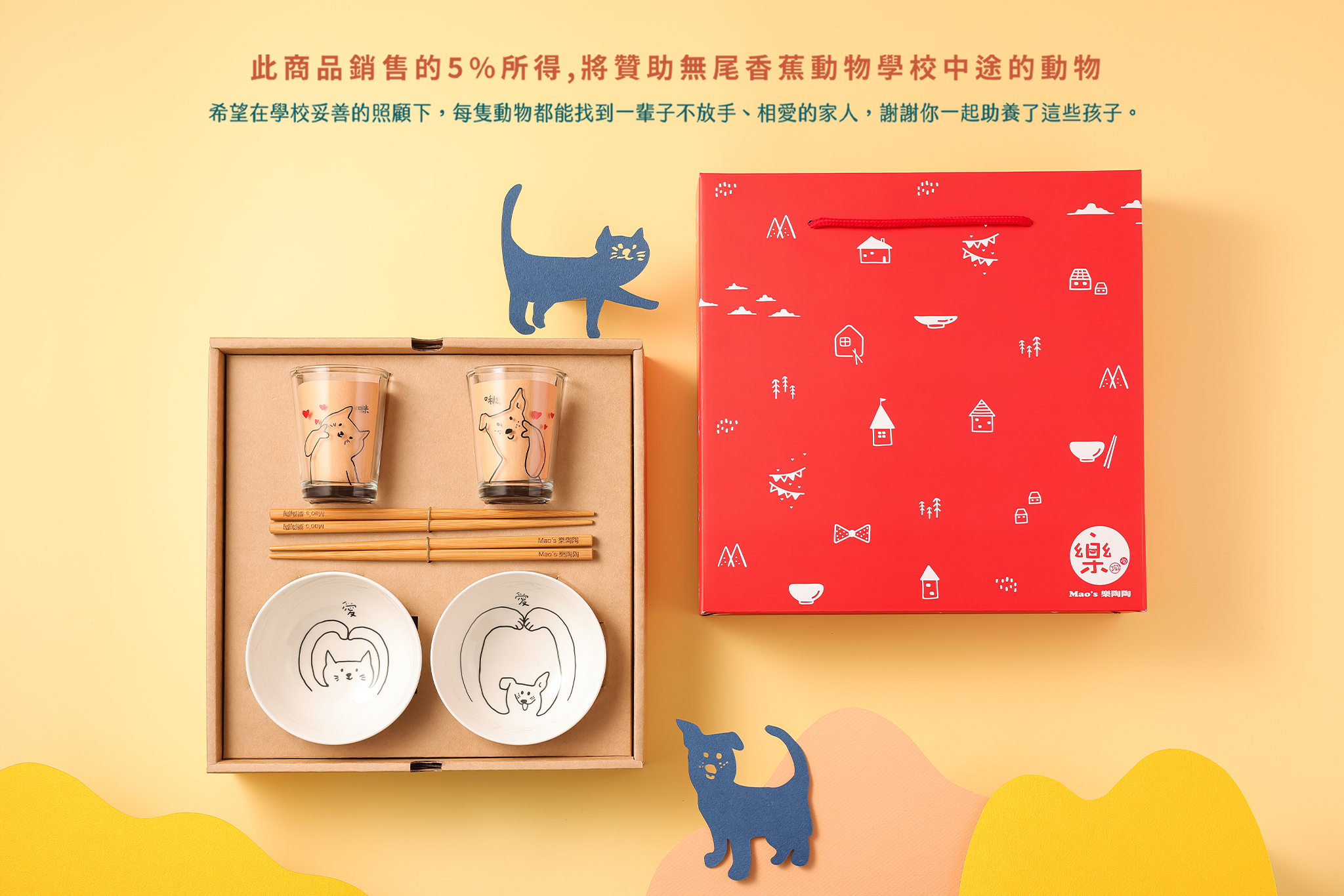 Mao’s 樂陶陶公益計畫邁向第三年,從自身到品牌,始終關注著流浪動物的議題。2023年與李瑾倫「無尾香蕉動物學校」攜手聯名,詮釋貓狗孩子的一日生活日常,將他們可愛的肢體動作化為圖像,大聲的對你說愛,讓愛貓、愛狗、愛動物的你,都能在餐桌上擁有與毛孩相伴的友愛時光,一起享受成為家人的每一天。