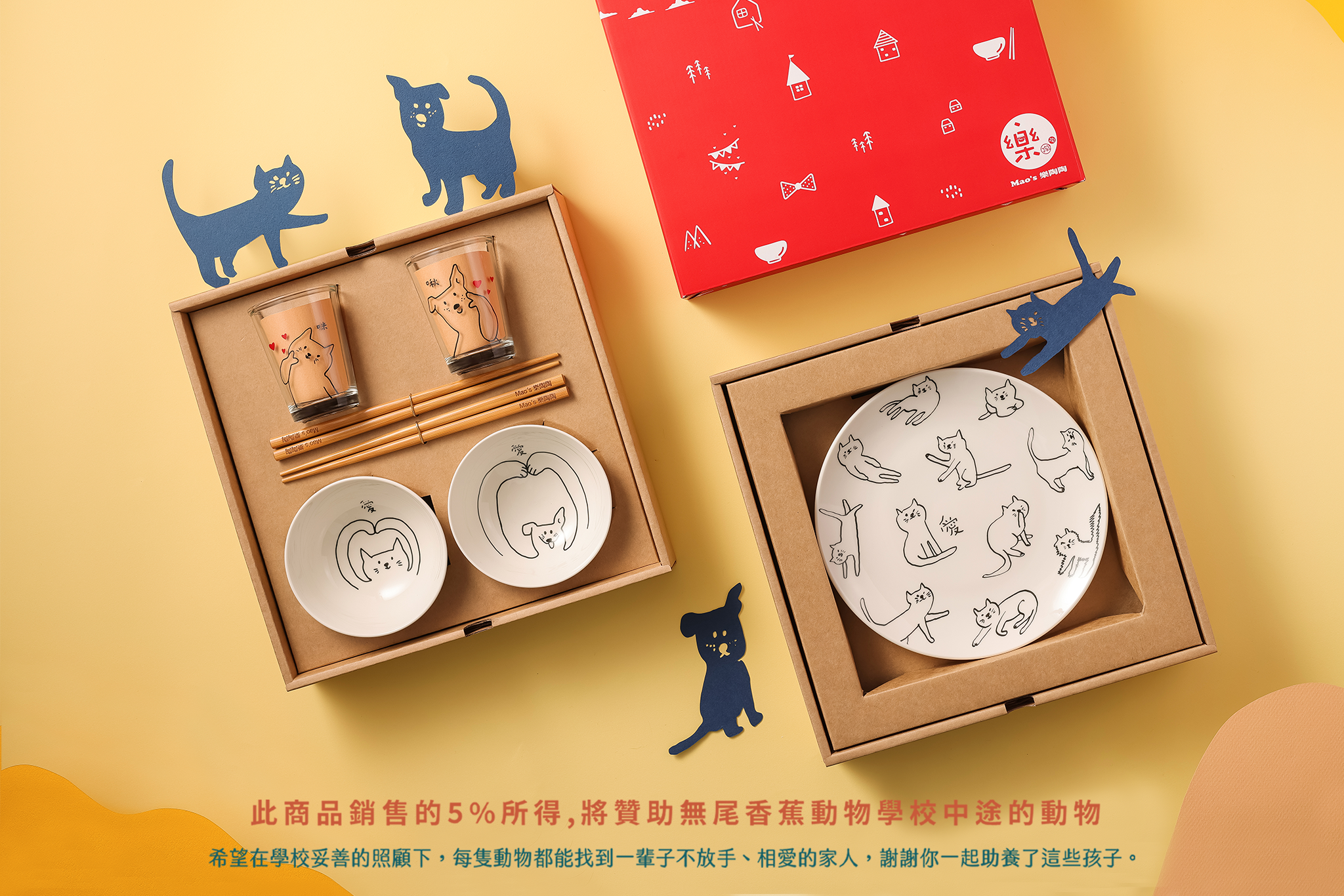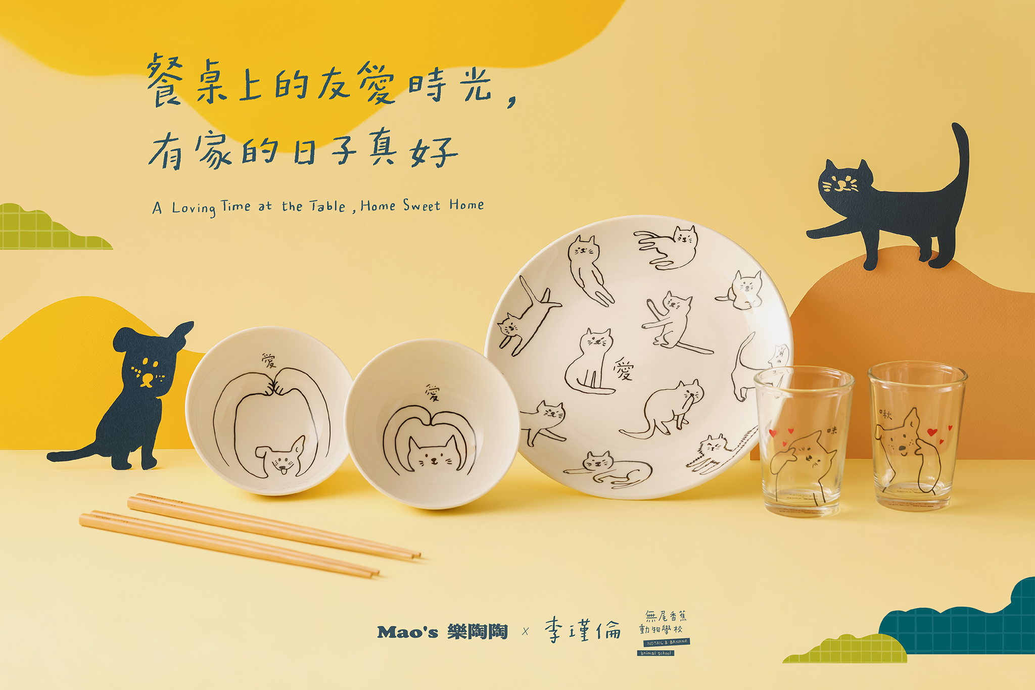 Mao’s 樂陶陶公益計畫邁向第三年,從自身到品牌,始終關注著流浪動物的議題。2023年與李瑾倫「無尾香蕉動物學校」攜手聯名,詮釋貓狗孩子的一日生活日常,將他們可愛的肢體動作化為圖像,大聲的對你說愛,讓愛貓、愛狗、愛動物的你,都能在餐桌上擁有與毛孩相伴的友愛時光,一起享受成為家人的每一天。