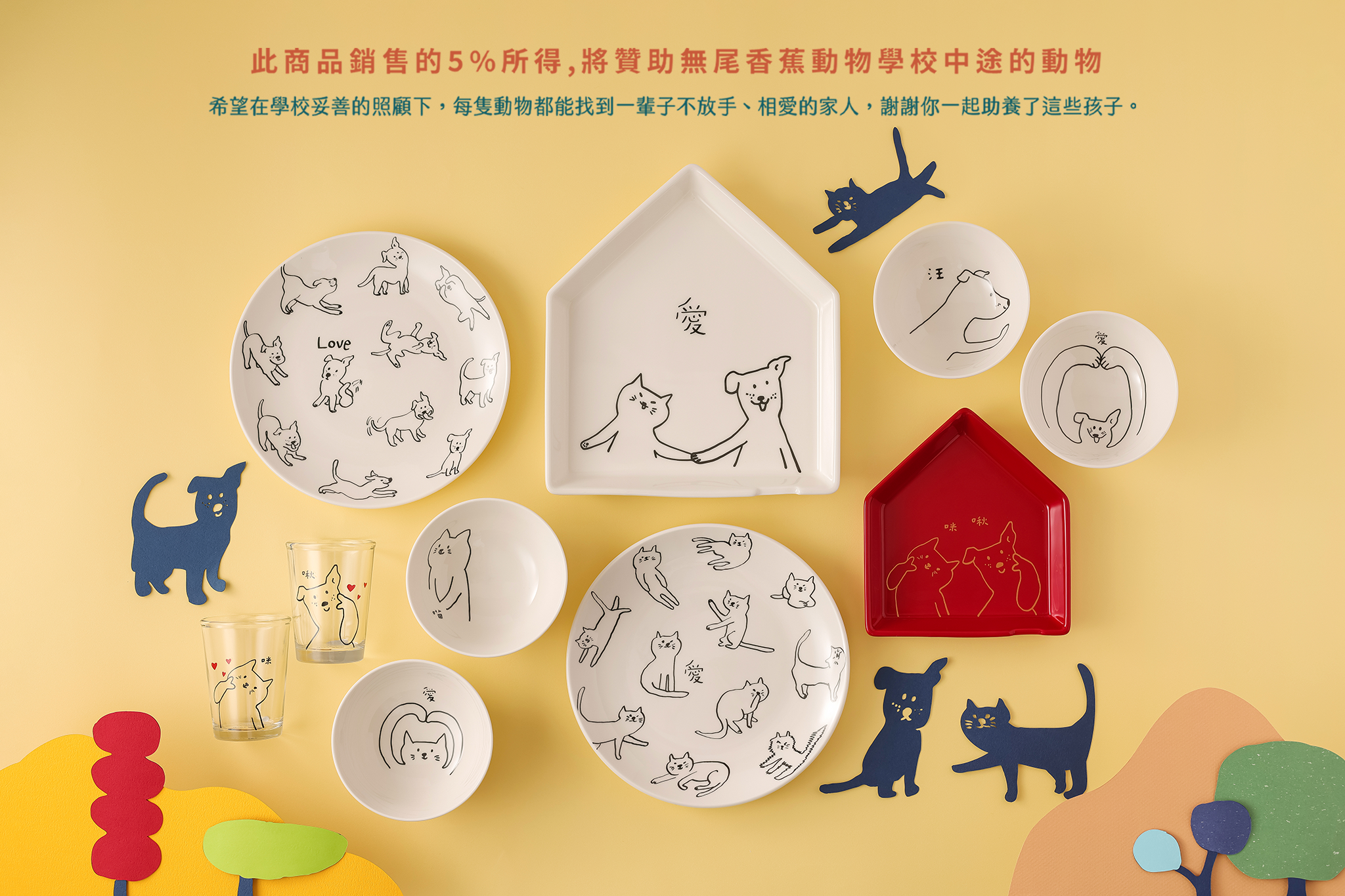▲ 「愛貓愛狗聯名系列商品」銷售的5%所得,將贊助「無尾香蕉動物學校」中途的動物,希望在學校妥善的照顧下,讓每隻動物都能找到一輩子不放手、相愛的家人。