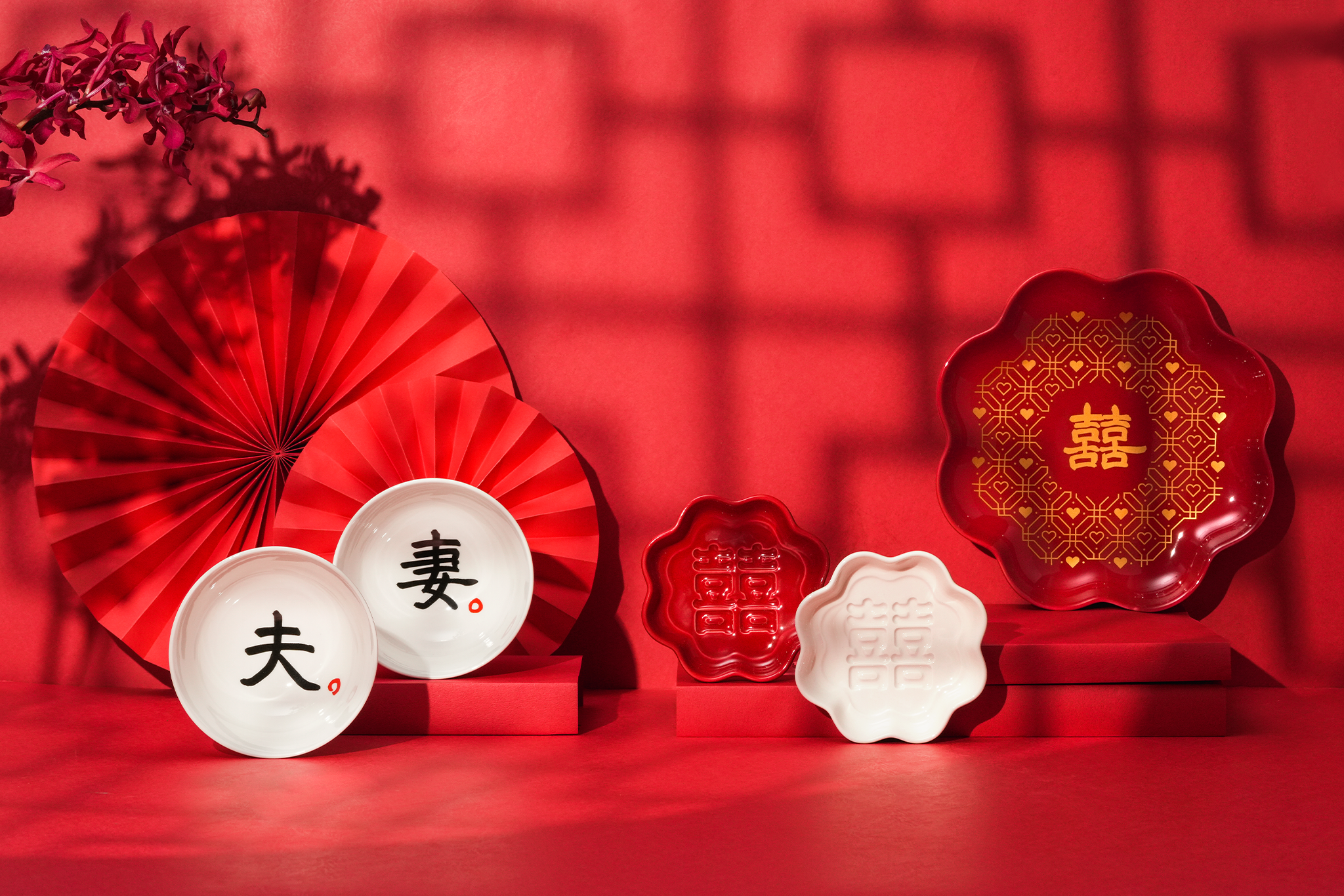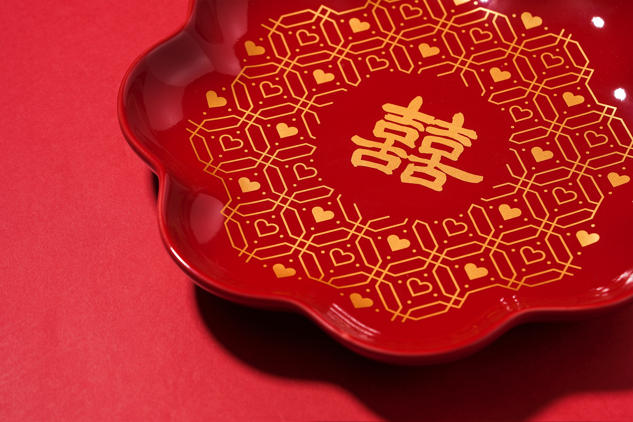 ▲ 夫妻囍囍紅花盤,金紅色的搭配,喜氣滿滿,盛裝了幸福的滋味。