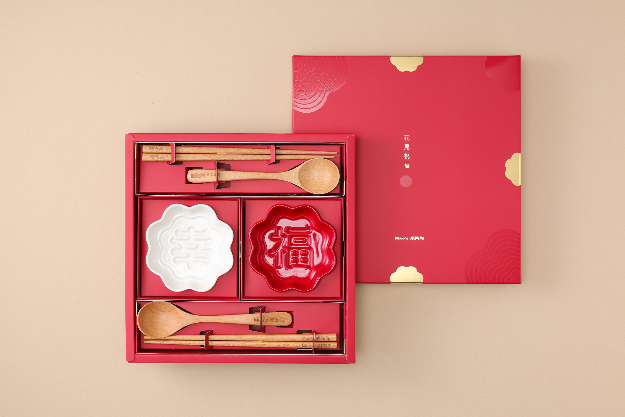• 內容物:花見醬油碟2入、筷子2雙、湯匙2入、上蓋式燙金禮盒1入