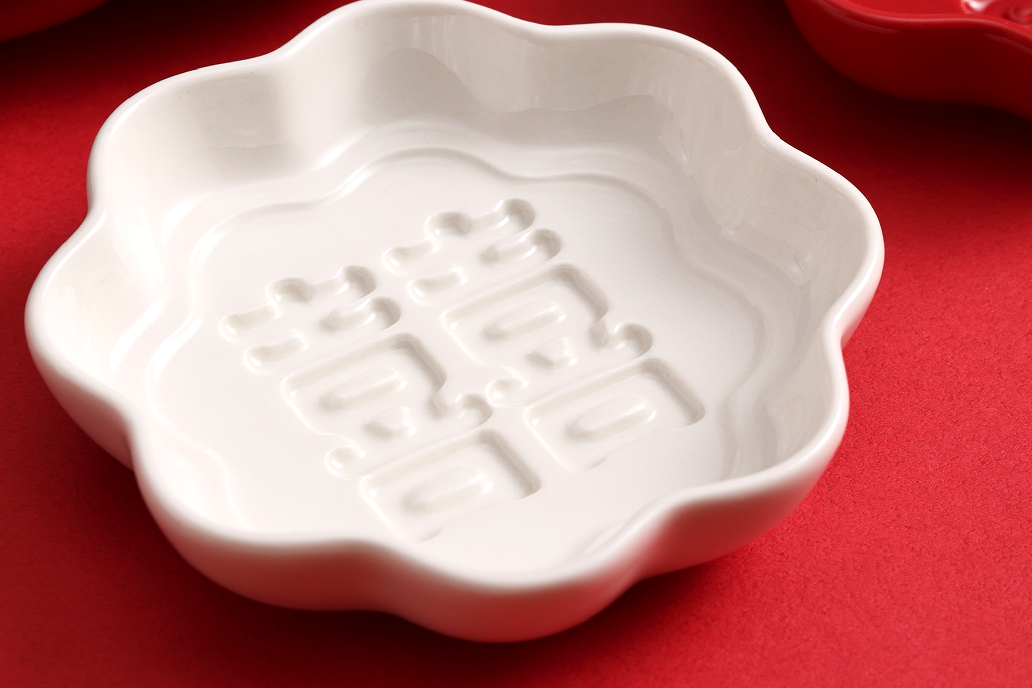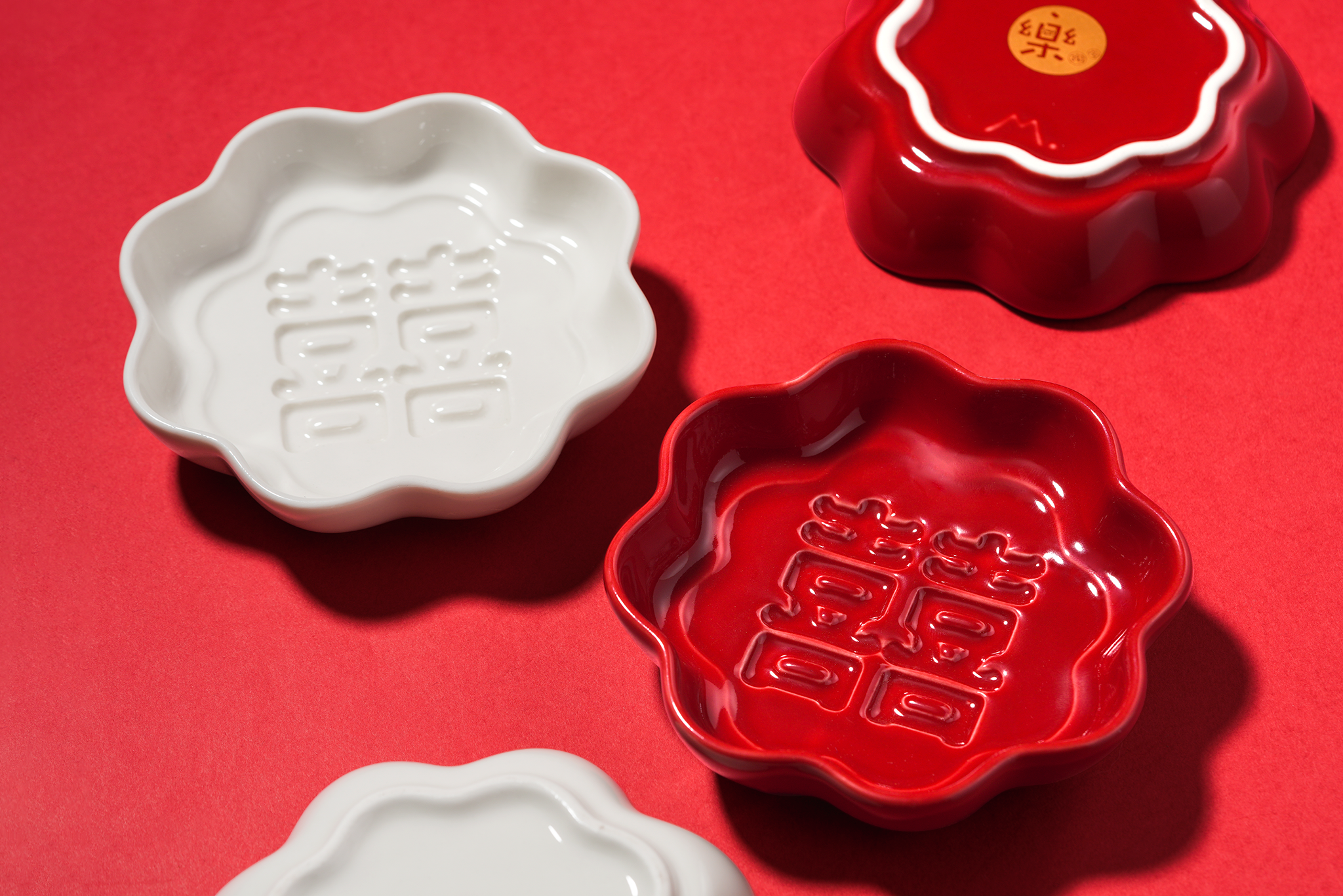 ▲ 花見囍囍顯影醬油碟,將充滿愛與祝福的文字刻畫於醬油碟內,運用陶瓷的工藝技術,設計出筆劃飽滿、溫潤有力的字體造型。