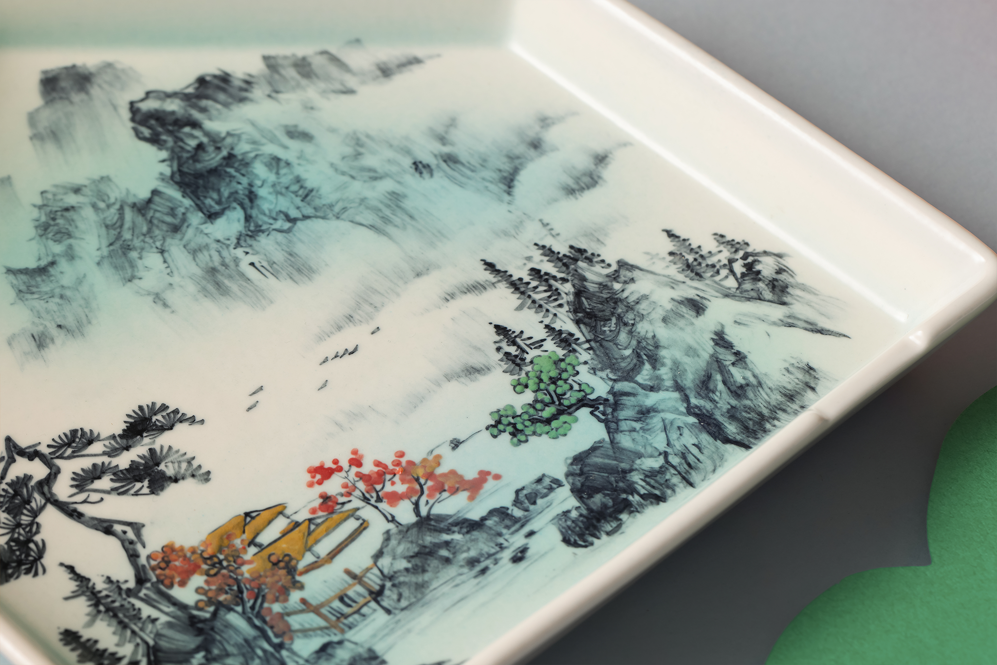 ▲ 山水系列大房子餐盤,以細膩的畫工呈現雲霧繚繞、山林交疊、遠山近水立體之感。
